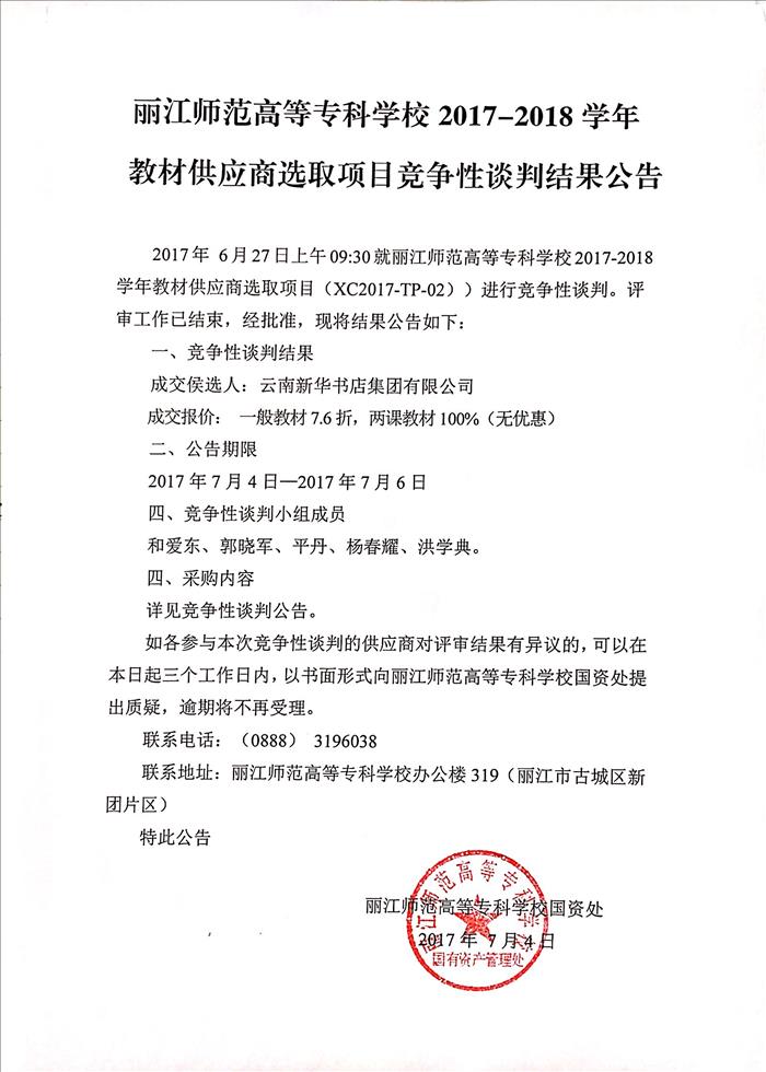上一条:丽江师范高等专科学校运动服、运动鞋、办公家具、办公设备、LED显示屏政府采购询价采购项目二标段办公家具询价采购结果公告 下一条:丽江师范高等专科学校草坪绿化工程采购项目竞争性谈判公告(二次)