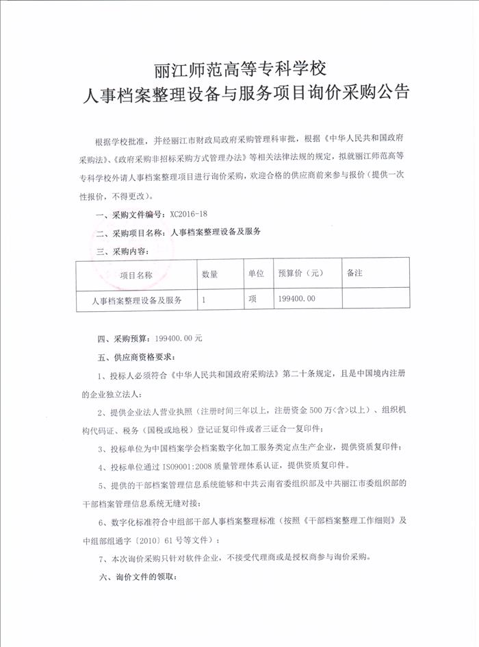 丽江师范高等专科学校人事档案整理设备与服务项目询价采购公告