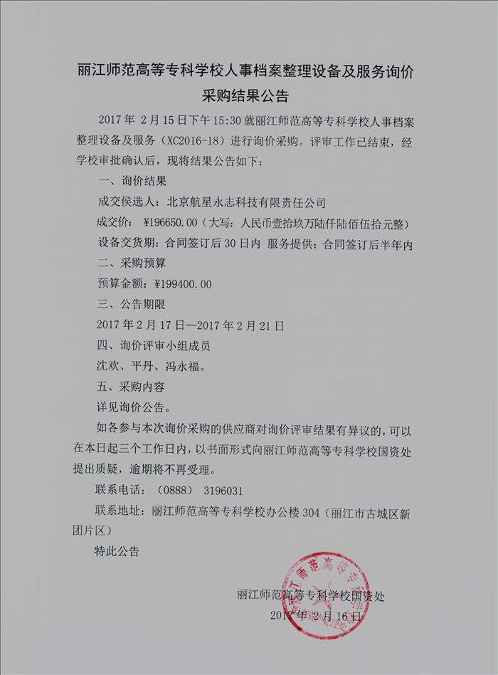 丽江师范高等专科学校人事档案整理设备及服务询价采购结果公告