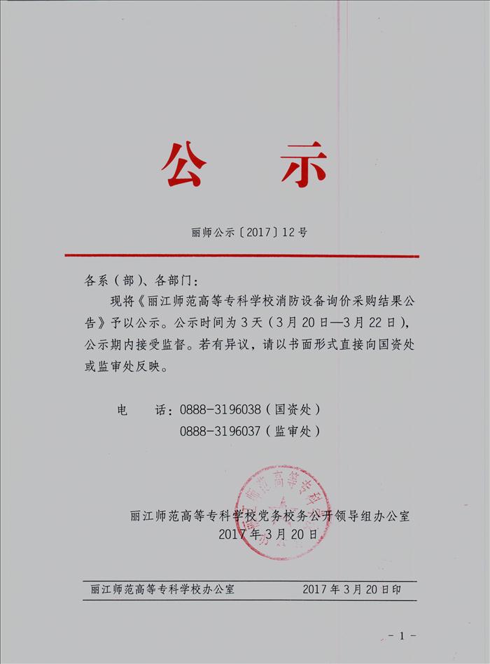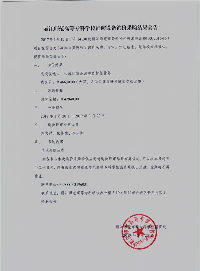 丽江师范高等专科学校消防设备询价采购结果公告