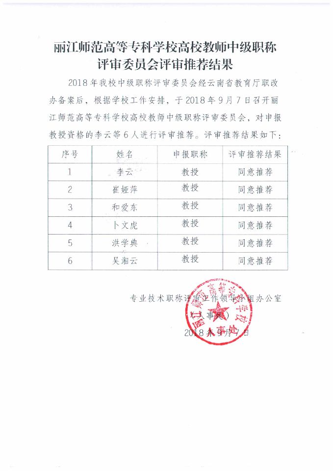 丽江师范高等专科学校高校教师中级职称评审委员会评审及评审推荐结果-教授