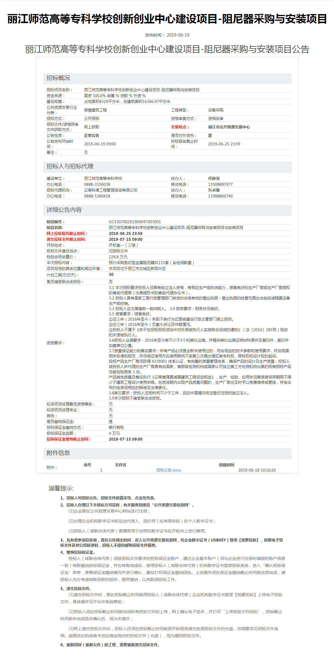 丽江师范高等专科学校创新创业中心建设项目-阻尼器采购与安装项目公告