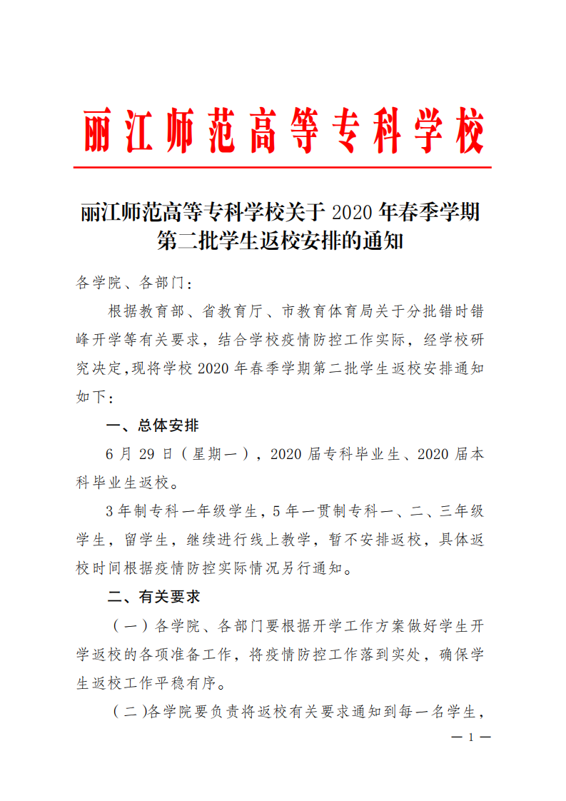 丽江师范高等专科学校关于2020年春季学期第二批学生返校安排的通知