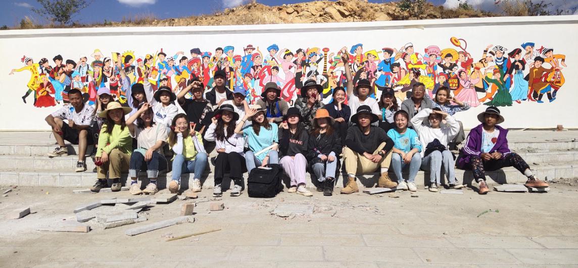 带队的三位老师,艺术学院党总支杨鸿荣老师、易立平老师,艺术学院和国强老师,除了每天要完成墙绘的设计工作和绘制工作外,还对要学生的安全和纪律进行管理,保证了在完成项目的同时,零安全事故的工作任务。结合本次项目体量大的特点,他们分工明确,组织得力,在短短的4天内,总共绘制了将近900平方米的墙绘,为助力乡村振兴、民族团结的时代精神添砖加瓦。