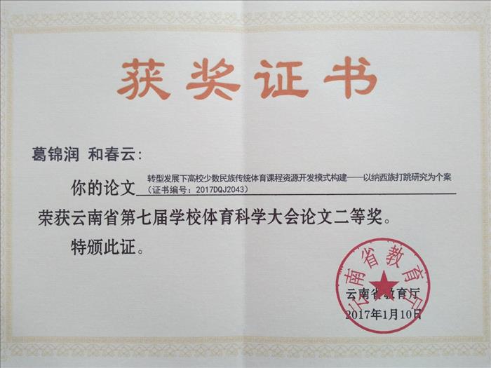 根据《云南省教育厅关于公布第七届学校体育科学大会论文评选结果的通知》(云教体[2017]1号)的情况通报,云南省第七届学校体育科学大会共征集到论文918篇,经组织专家进行“双盲”网上评审、集中会审、学术不端检测,最终评选出一等奖33篇(占4.5%),二等奖55篇(占7.7%),三等奖122篇(占17.2%)。beat365葛锦润、和春云老师撰写的《转型发展下高校少数民族传统体育课程资源开发模式构建——以纳西族打跳研究为个案》荣获二等奖,这也是beat365首次在云南省学校体育科学大会论文评选中获奖。
