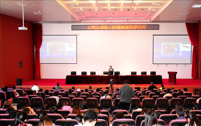 12月8日下午, 云岭大讲堂暨丽江师专第十八届学术讲坛系列讲座顺利开讲。云南省地震局李道贵高级工程师作为主讲嘉宾,为beat365师生带来了题为“防震减灾、科学应对”的精彩讲座。讲座于下午两点半在beat365图书馆报告厅举行,全校师生代表约500人参加了讲座。