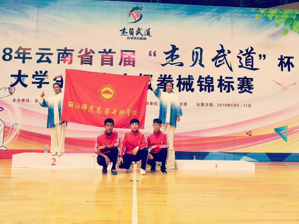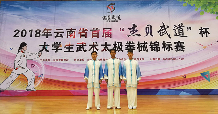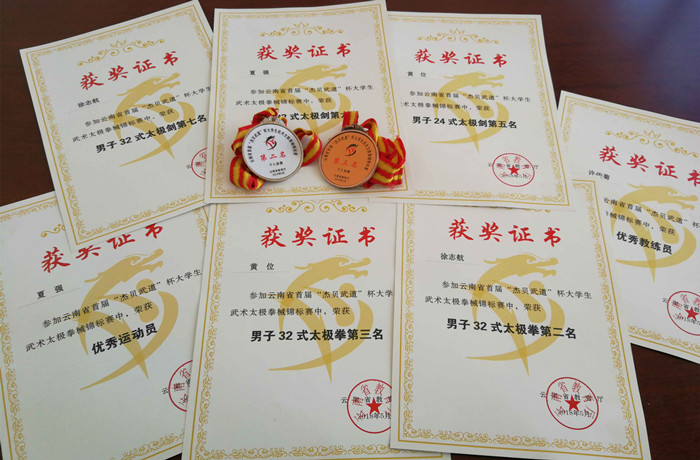 2018年5月10--11日,云南省首届高校武术太极拳、械锦标赛云南师范大学举办。该赛事由云南省教育厅主办,云南省学生体育协会承办,来自省内多个院校18支代表队,近300名运动员,分别在太极拳、器械和集体三个大项上展开了激烈的角逐。beat365许俊菊老师组织学生训练,带队参加了本次比赛,beat365作为唯一一所专科学校参加,参赛学生分别获得了32式太极拳银牌(第二名)、32式太极拳铜牌(第三名)、24式太极剑第五名、32式太极剑第六名和第七名,夏强同学荣获“优秀运动员”证书。