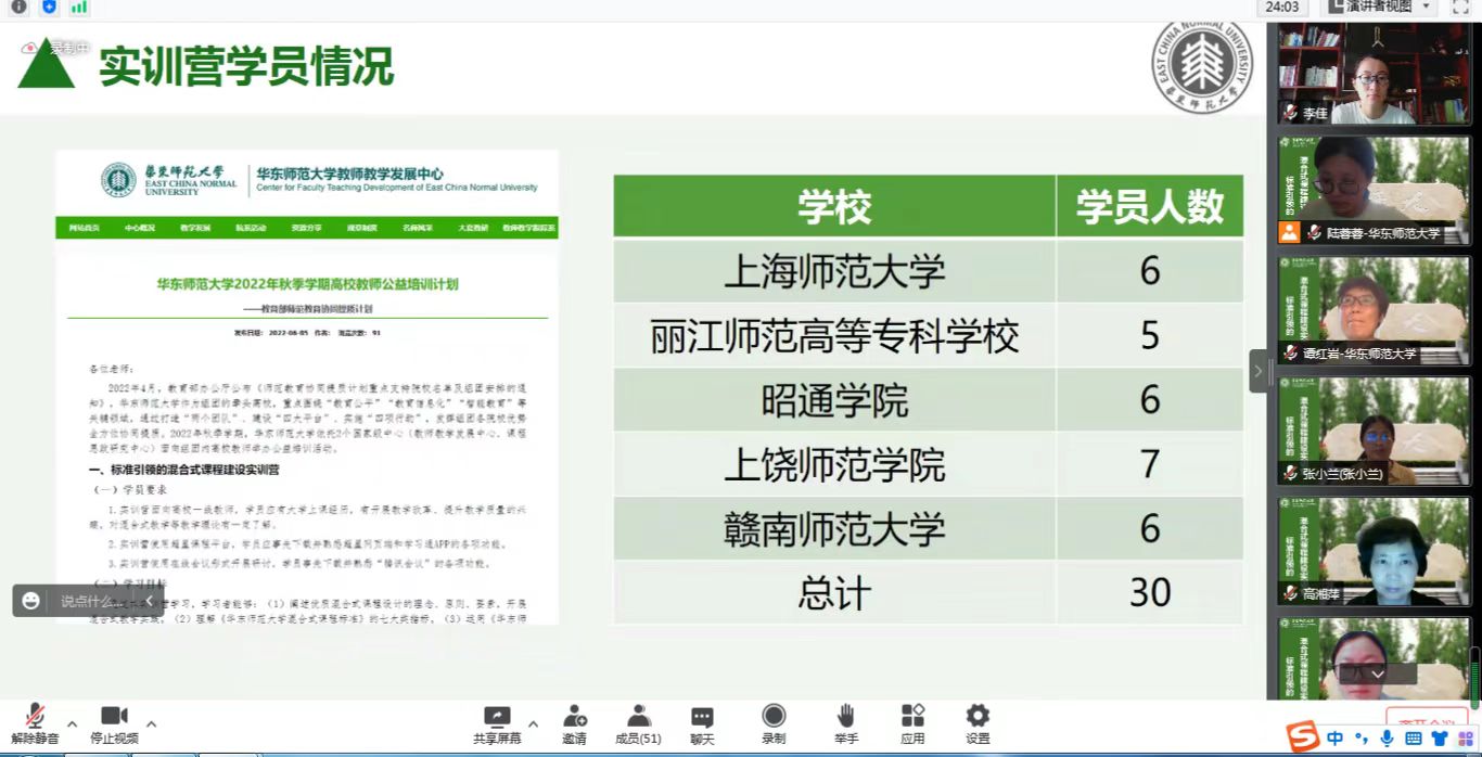 为进一步推进师范教育协同提质计划,促进教师教学改革能力提升, 2022年7月12日至19日华东师范大学组织了“第2期标准引领的混合式课程建设实训营”培训活动。上海师范大学、上饶师范学院、赣南师范大学、昭通学院、丽江师范高等专科学校共30名教师参加了培训。