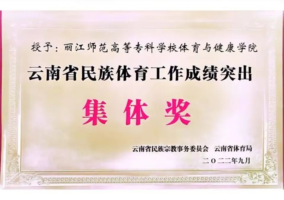 近日,云南省民族宗教事务委员会和云南省体育局联合下发了《关于评定民族体育工作成绩突出集体和个人的通知》,体育与健康学院荣获“云南省民族体育工作成绩突出集体奖”。