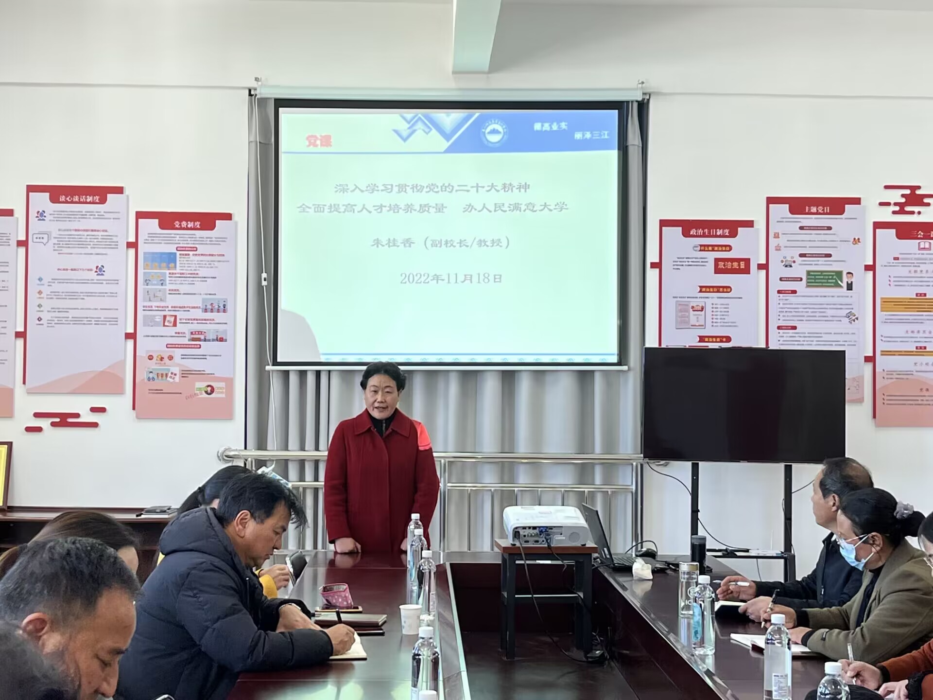 朱桂香以《深入学习贯彻党的二十大精神 全面提高人才培养质量 办人民满意大学》为题,从党的二十大会议主题、新时代新征程中国共产党的使命任务、办人民满意的教育等方面进行了深入讲解。