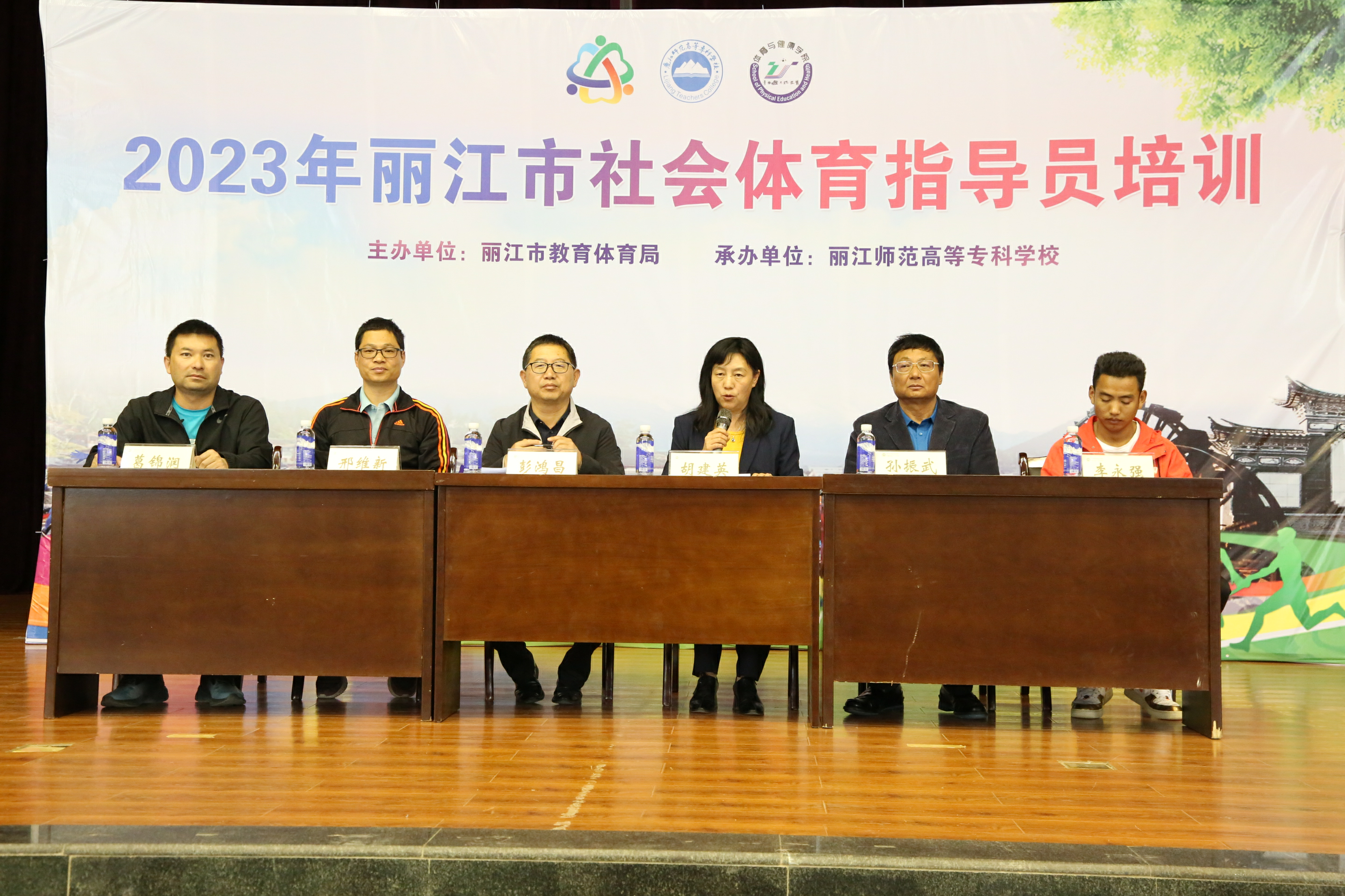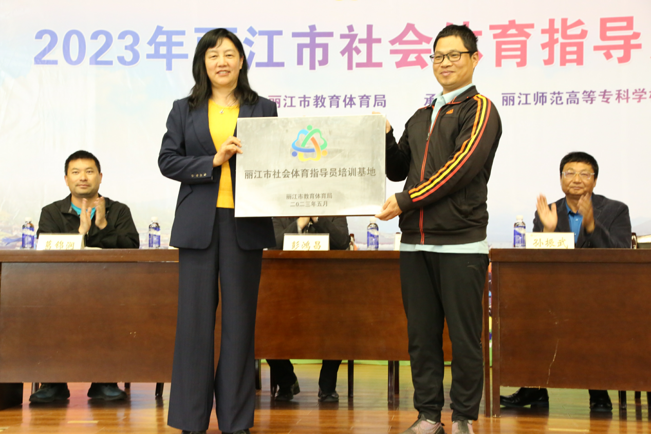 胡建英代表丽江市教育体育局对学校长期以来对丽江体育工作的支持和配合表示感谢,希望学校在以后的基地建设中立足本校、扎根丽江、服务全市,通过常态化开展社会体育指导员培训,积极培养全民健身服务人才。同时表示市教体局将以此次合作作为新起点,在裁判员培训、赛事组织等方面进一步深化合作,共同助推体育赋能丽江经济社会高质量发展。随后,胡建英为“丽江市社会体育指导员培训基地”授牌。
