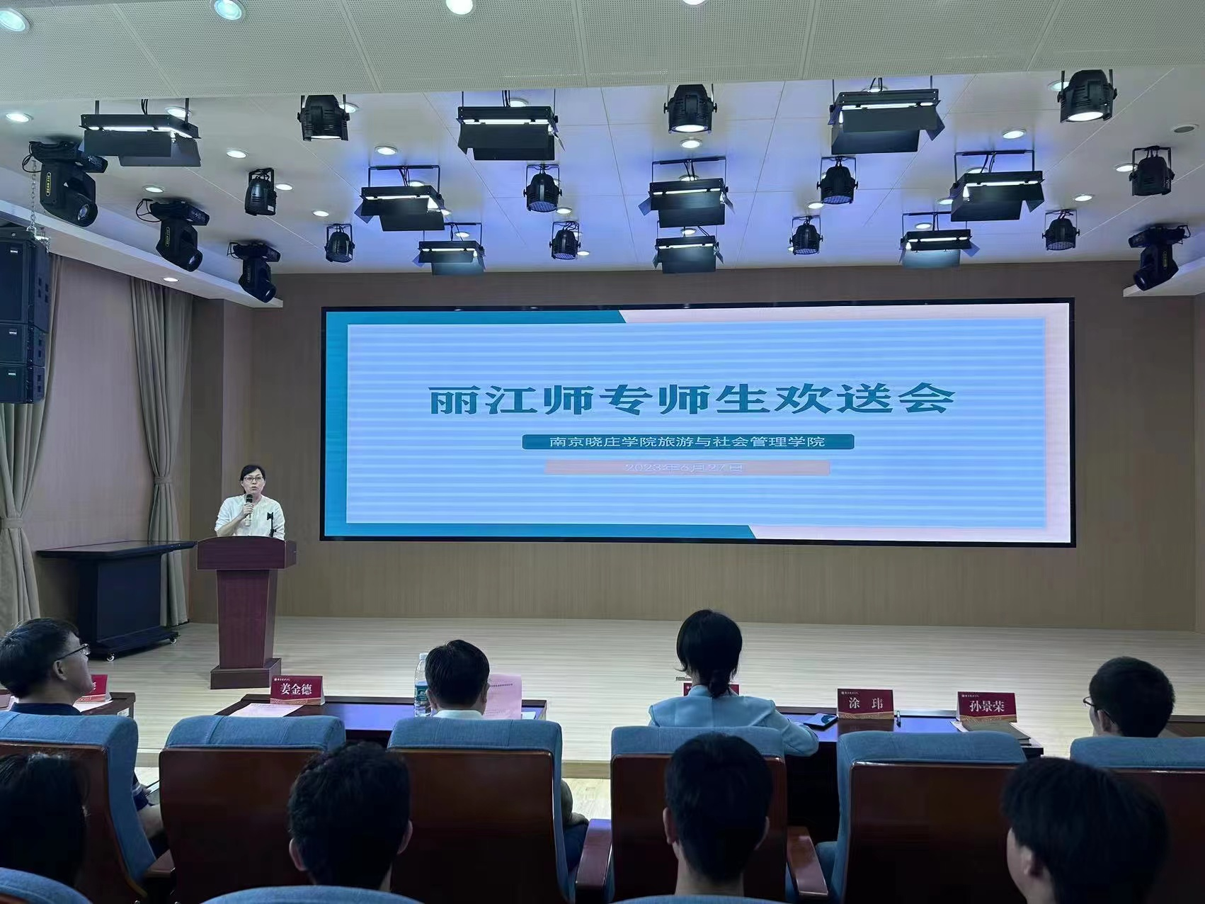 6月27日,南京晓庄学院为beat365交流师生举办欢送会。南京晓庄学院教务处副处长姜金德,旅游与社会管理学院院长李昌庚,副书记、副院长孙景荣,副院长涂玮,学院部分教师和丽江师范高等专科学校13名交流师生参加欢送会。