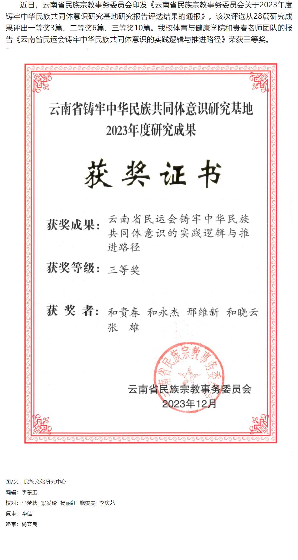 喜讯丨学校在2023年度云南省铸牢中华民族共同体意识研究基地研究成果评选中获奖