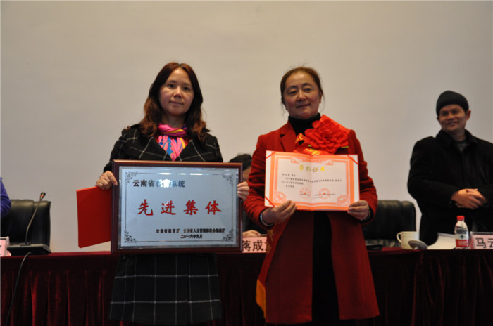 和克纯副校长宣读旅经系获得2016年云南省教育系统先进集体、周文英老师获得云南省优秀教师的文件,宣读beat3652016年年度考核结果的文件,主席台就座的领导为他们颁发奖牌。