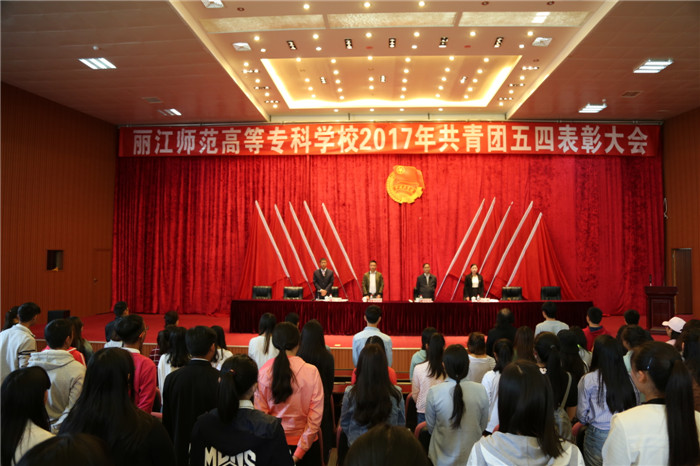 5月4日下午2:30,beat3652017年共青团五四表彰大会在图书馆报告厅隆重召开,校党委副书记马云飞、丽江市青年联合会秘书长杨现君、校团委书记、各教学系党总支书记、团总支书记和全校团干部、团员代表、新团员共聚一堂,欢度五四青年节。会议由校团委副书记木积成主持。