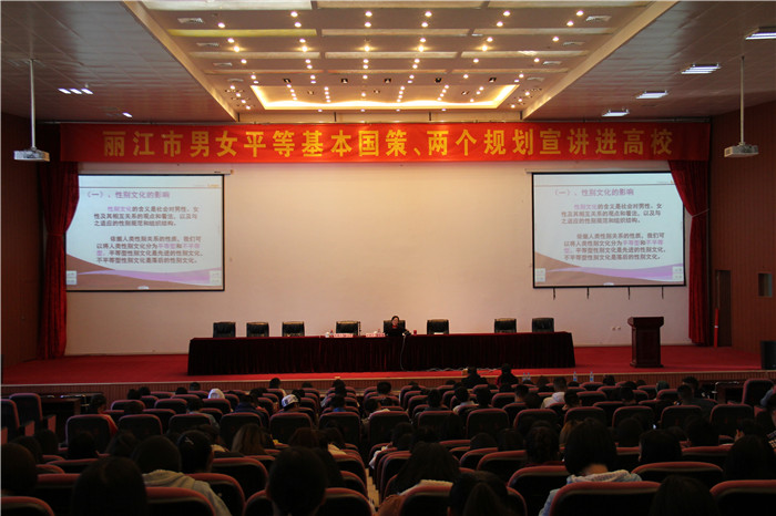 活动主要分为两个部分。主讲人丽江市委党校外训部副主任曾松涛首先作了“男女平等基本国策、两个规划”为主题的演讲。她讲述了为什么要男女平等、社会上部分男女不平等现象以及怎么结合实际来贯彻落实男女平等等问题。期间不断与学生们互动,了解学生想法。