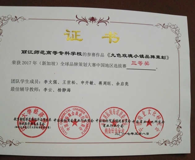 “九色玫瑰小镇”品牌策划在大赛中荣获集体及个人三等奖,李云老师和杨静海老师荣获品牌大赛 “优秀指导教师”奖,丽江九色玫瑰小镇有限公司荣获“优秀企业奖”。