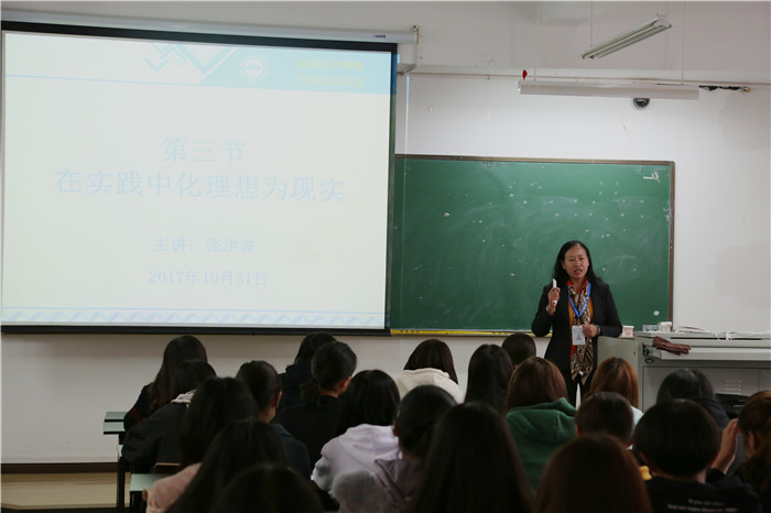 10月31日下午,张洪波校长在教学楼620教室为艺术系2017级音乐教育、美术教育班的学生上了一堂精彩的思想政治理论课,课堂内容为《思想道德修养与法律基础》第一章“追求远大理想 坚定崇高信念”第三节“在实践中化理想为现实”。