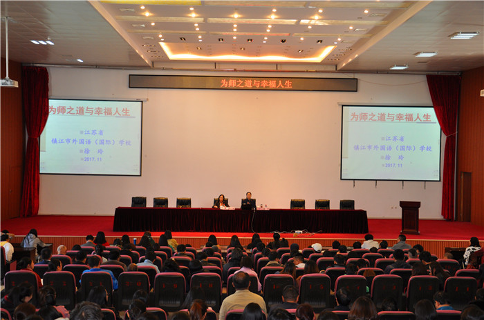 11月2日下午15:00,中国青少年传统文化研究院首批国家级研究员、镇江市外国语学校副校长徐玲在beat365图书馆报告厅作了题为“为师之道与幸福人生”的专题报告会,张洪波校长主持报告会,副校长朱桂香和300余名师生代表参加报告会。