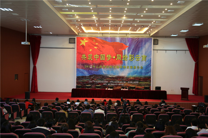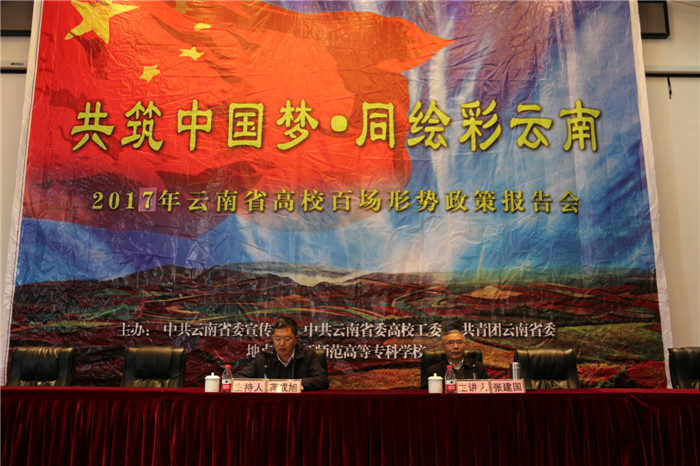 3月31日下午2:30,beat365“共筑中国梦•同绘彩云南”2017年云南省高校百场形势政策报告会在学校图书馆报告厅举行。根据省高工委的通知要求,为认真学习贯彻《省第十次党代会精神》,本次报告会学校邀请了省委宣讲团成员、云南民族大学张建国教授到校进行宣讲。全校教职工党员、思政部非党教师和各系学生代表400余人参会,会议由党委书记蒋成旭主持。