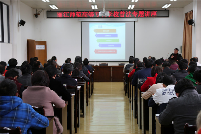 2017年11月24日下午,学校法律顾问、丽江市律师协会会长田学勇在第四会议室给全校科以上干部作题为《合同的起草与审查》普法专题讲座。