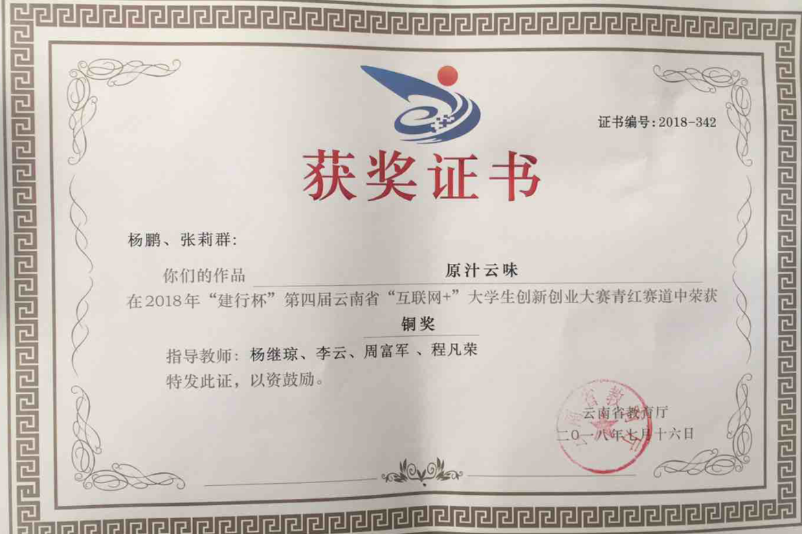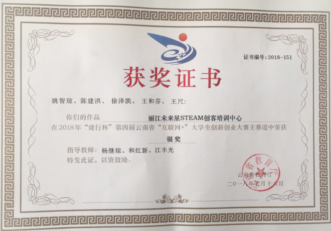 由杨继琼、和红新、江丰光老师指导的姚智琼、陈建洪、徐泽凯、王和芬、王尺同学以“丽江未来星STEAM创客培训中心”项目在主赛道中获银奖;由陈光富、李佳老师指导的周永国、农正江、罗建美、朱丽娟、赵娜同学以“芳学思思教育”项目在主赛道中获银奖;由李佳老师指导的刘丽保、邵明朵、鲁家仙、刘丽乐同学以“校园微文印”项目在主赛道中获铜奖;由杨继琼、李云、周富军、程凡荣指导的杨鹏、张莉群等同学以“原汁云味”项目在青年红色逐梦之旅赛道中获铜奖。