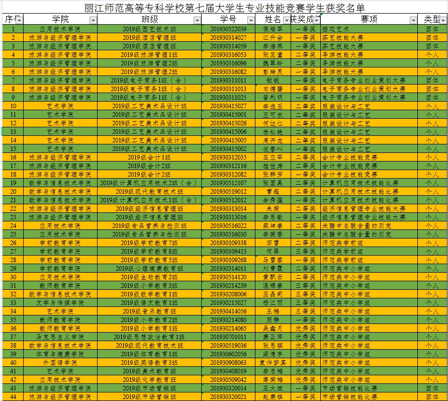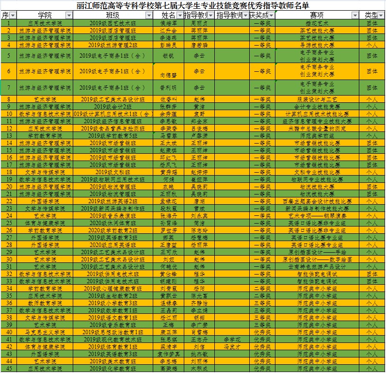beat365第七届大学生专业技能竞赛于2020下半年成功举办,竞赛分为师范类专业组和高职类专业组,师范类专业组对接云南省高等学校教师教育联盟师范专业大学生教学技能竞赛,高职类专业组对接云南省职业院校技能大赛。在指导老师的指导下,90名学生获得荣誉,45名老师获优秀指导教师。获奖名单如下: