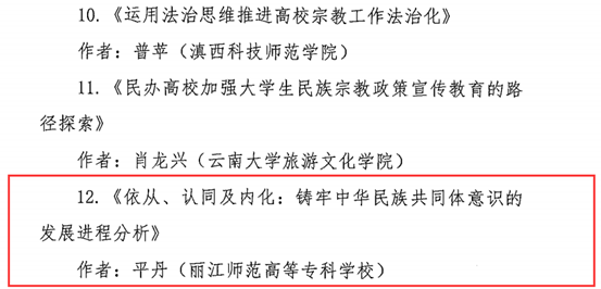 经中共云南省委统战部、中共云南省委高校工委评选,最终,平丹老师的《依从、认同及内化:铸牢中华民族共同体意识的发展进程分析》一文在157篇参评论文中脱颖而出,荣获二等奖。