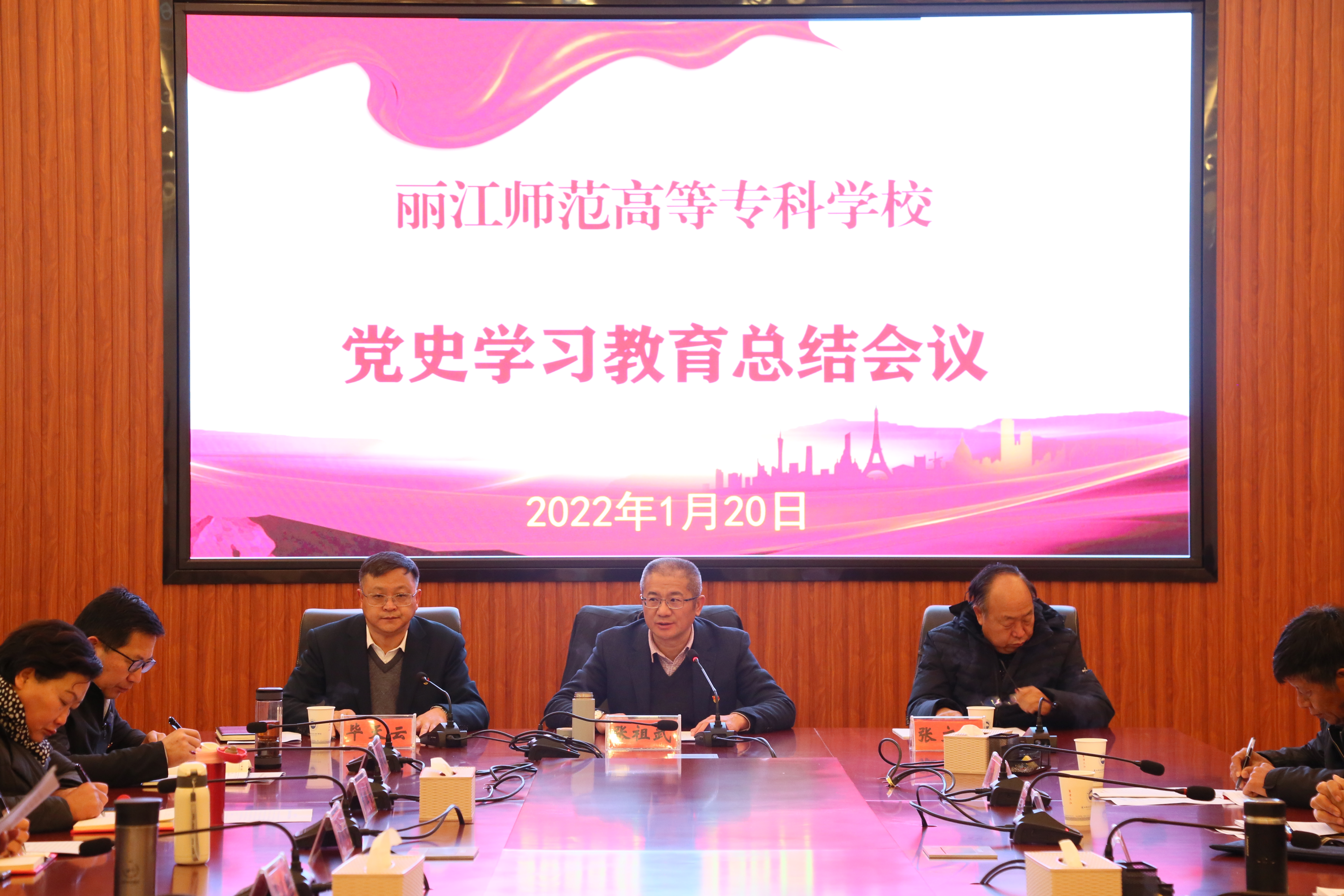 中共丽江市委党史学习教育第二巡回指导组组长张文银一行到会指导,学校党史学习教育领导小组成员,各党支部书记,党史学习教育领导小组办公室成员参加会议。校党委书记张祖武作党史学习教育总结讲话,党委副书记、校长毕天云主持会议。