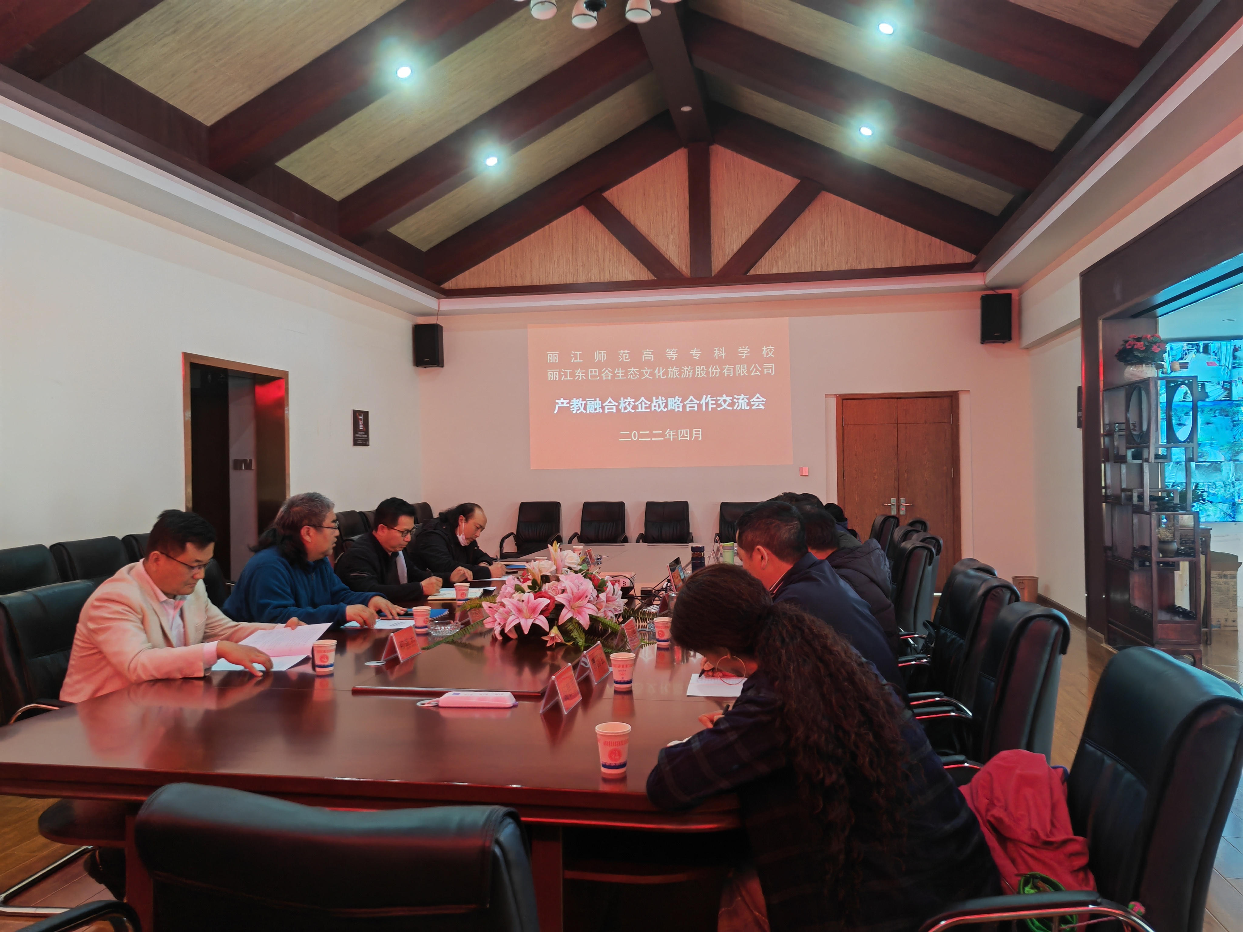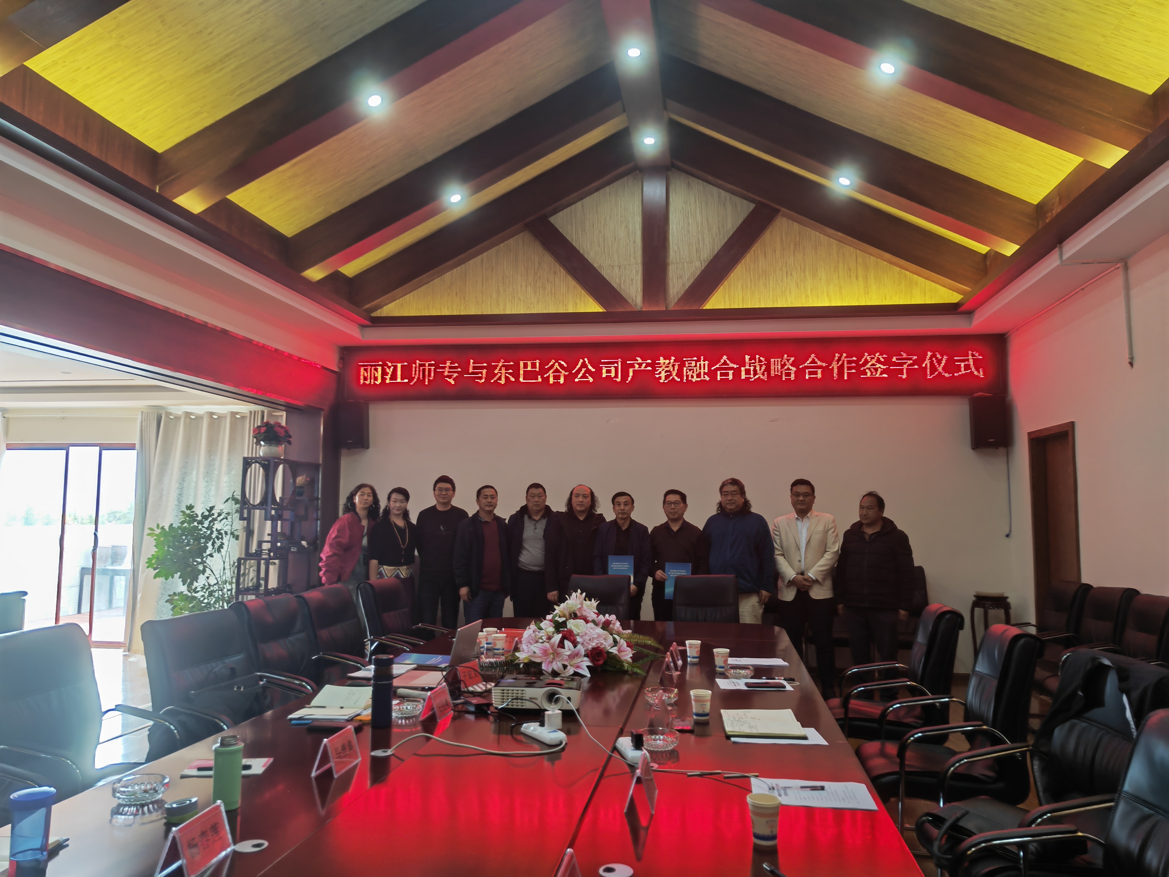 双方就校企战略合作召开产教融合交流座谈会,会议由丽江东巴谷生态文化旅游股份有限公司董事长王化新主持,丽江东巴谷生态文化旅游股份有限公司总经理马贵典、丽江东巴谷生态文化旅游股份有限公司董秘、执行总经理子宏文、丽江丽水金沙演艺有限公司总经理谭国红、有关部门负责人、学校党委副书记彭鸿昌、艺术学院党总支书记王飞、艺术学院院长和爱东、旅游与经济管理学院院长和燕杰、艺术学院副院长赵伟出席会议。