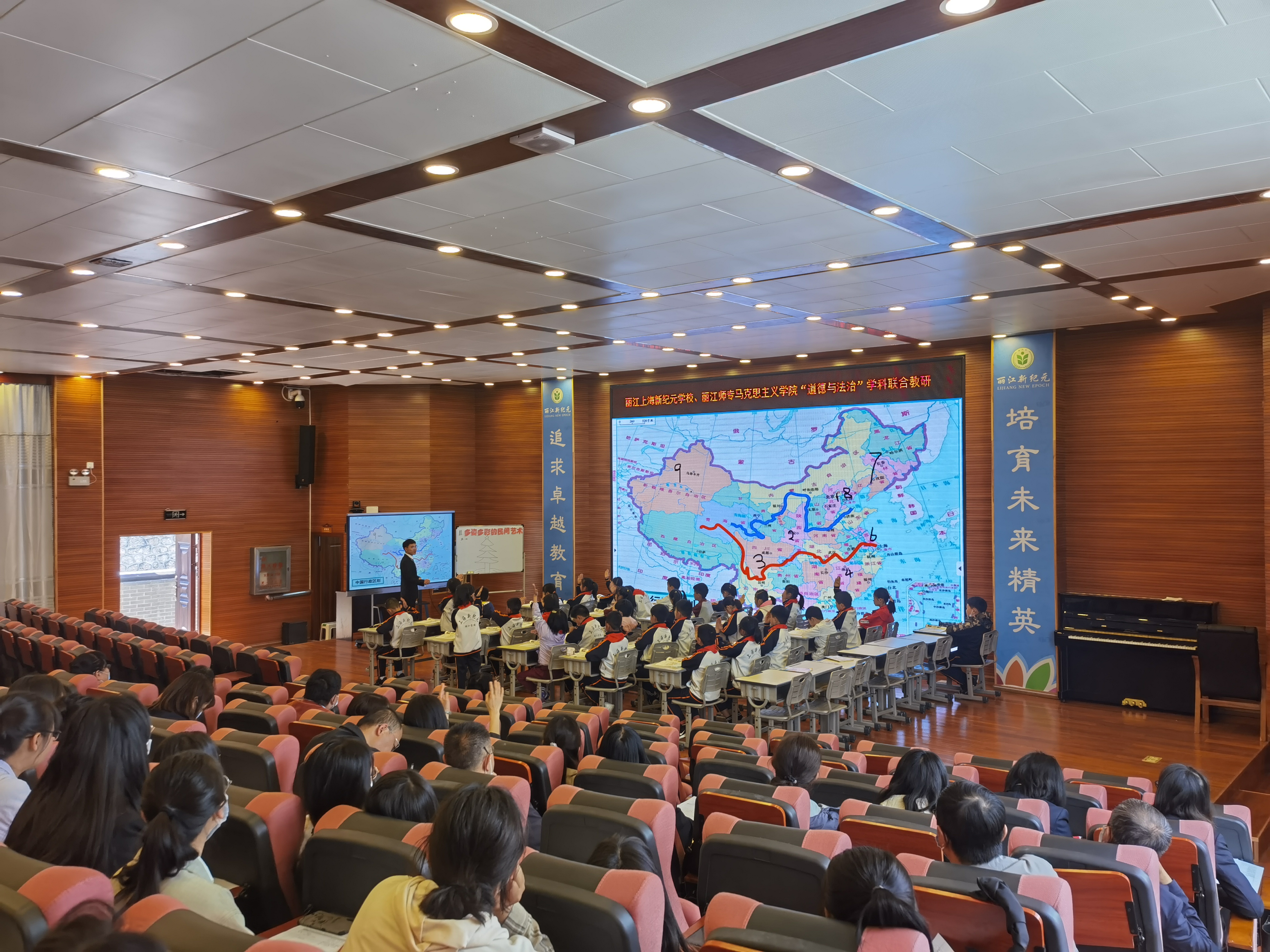 为了贯彻落实习近平总书记考察中国人民大学重要讲话精神和校长办公会研究思想政治理论课建设的安排部署,5月13日上午,马克思主义学院(以下简称“马院”)到丽江上海新纪元学校开展大中小学思政课一体化共建活动。教务处李桥春老师、马院全体教师,丽江上海新纪元学校刘艳华副校长、周洁副校长、《道德与法治》课程教师、新纪元学校两个四年级班级同学,丽师马院21位实习生参加了共建活动。