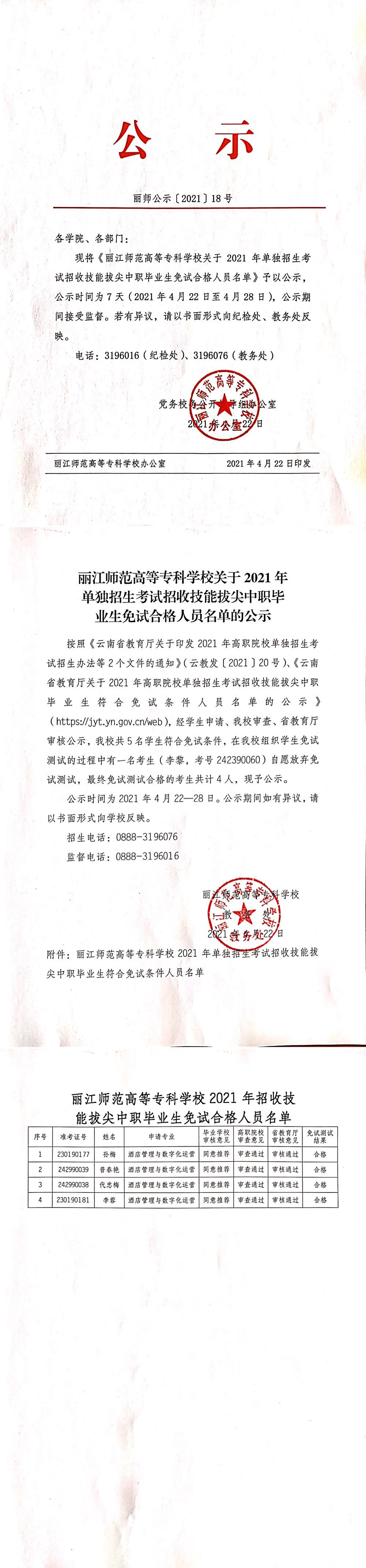 丽江师范高等专科学校关于2021年单独招生考试招收技能拔尖中职毕业生免试合格人员名单的公示