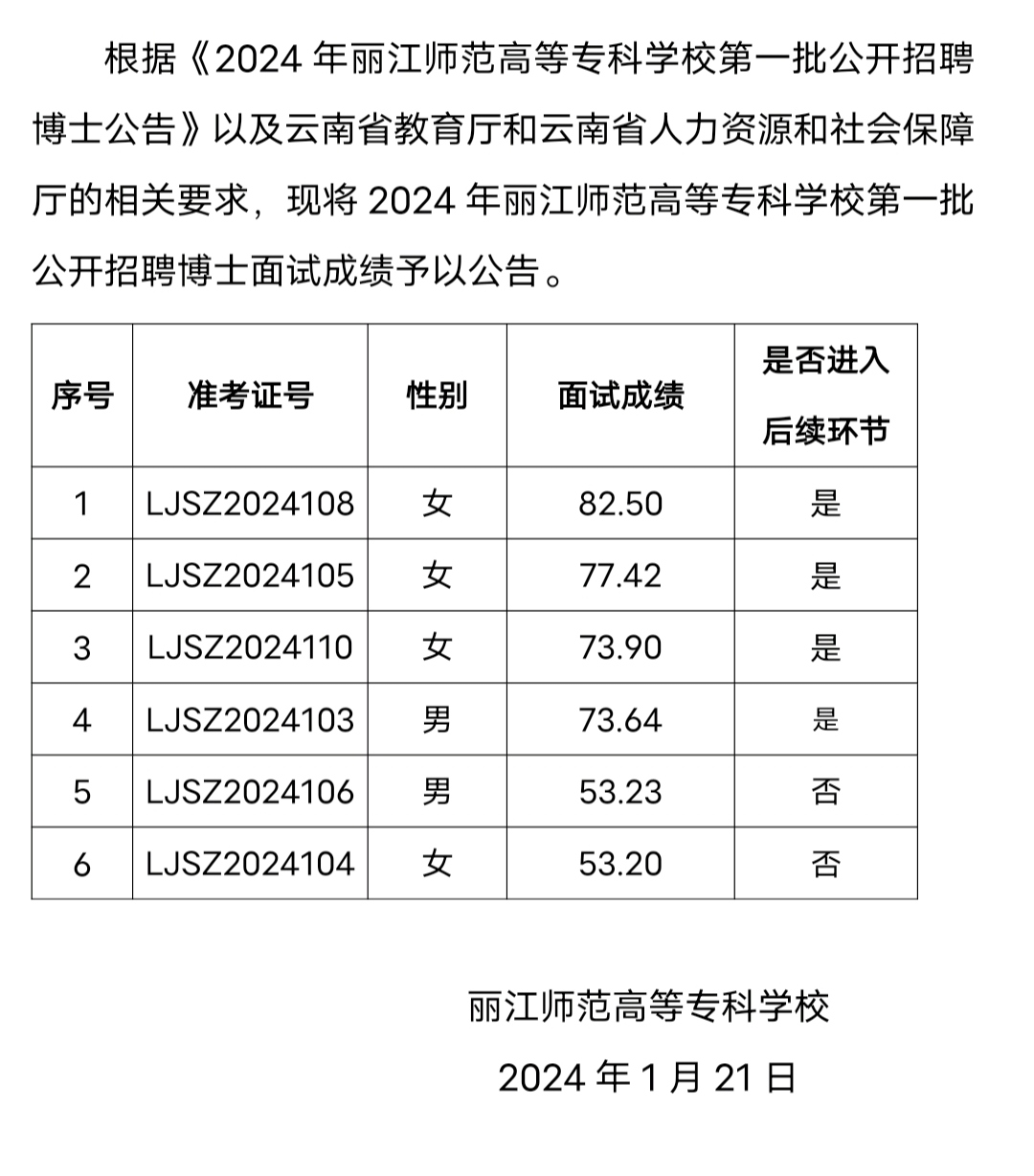 2024年丽江师范高等专科学校第一批公开招聘博士 面试成绩公告