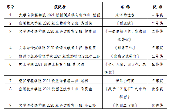 beat365积极组织学生参加由共青团丽江市委联合世界文化遗产丽江古城保护管理局、丽江市教育体育局、丽江古城管理有限责任公司举办的“奋进新征程乐享古城韵”系列活动之“漫步世界遗产 记忆丽江古城”主题征文活动。经过系列评审,全市76名选手获奖。其中,beat365学生荣获B组(高中及以上)一等奖1项,二等奖2项,三等奖4项,优秀奖2项。